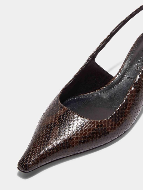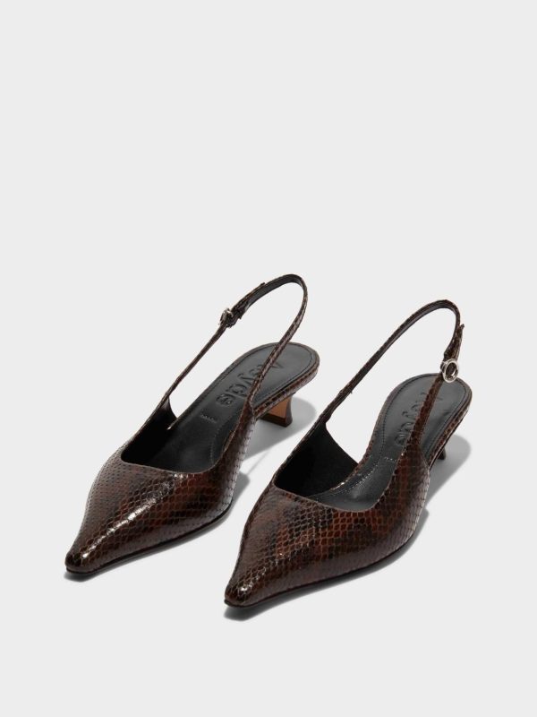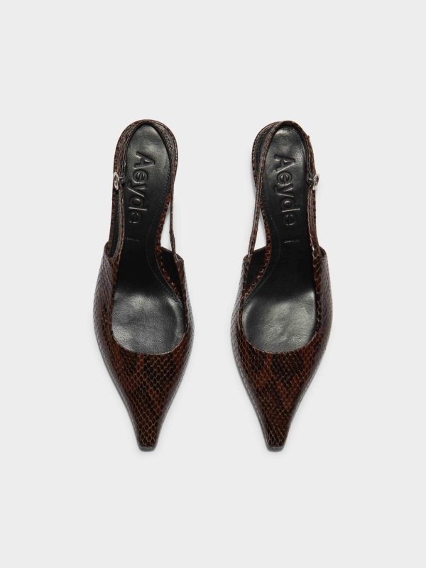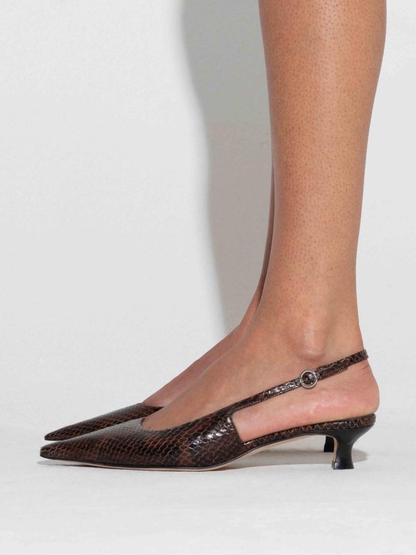 Aeyde’s elegant chisel-toe pumps featuring tapered kitten heels, adjustable slingback straps, and bespoke anti-slip soles. This season, we introduce Catrina in moka snake-effect calfskin leather.