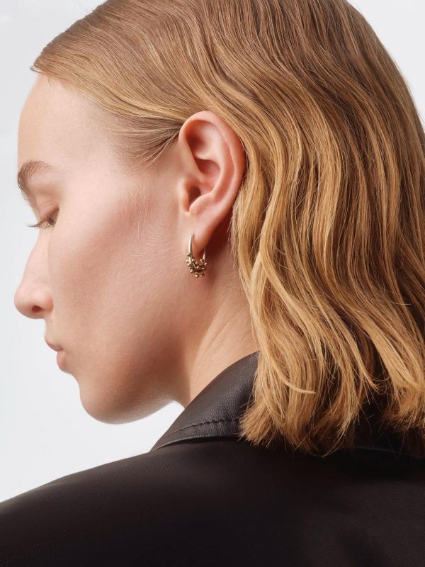 Elijah are miniature, contemporary hoop earrings that balance slender proportions with sculptural bases. This design features playful but subtle bubble or crystal detailing.
