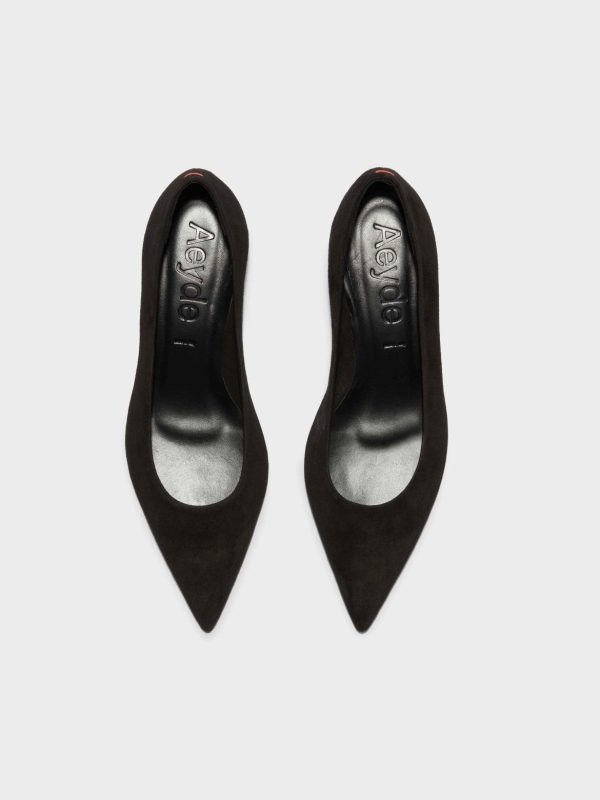 Judi are understated pumps that play on Aeyde’s affinity for point-toe shapes and tapered heels. This pair arrives in soft kid suede, amplifying the luxe look and feel of the seasonal colorways of black, moka, and red.