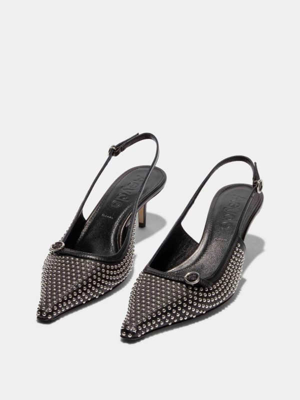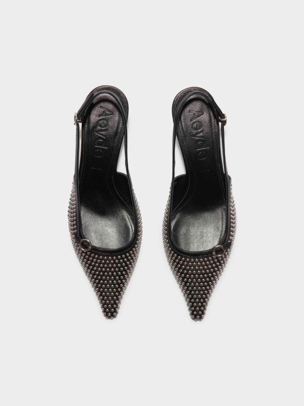 Built on the appeal of the slingback court, Aeyde’s Saba transforms the timeless style into something cutting-edge. Sitting on a spiked mid-heel, the modern chisel-toe bedecked with miniature studs, slim adjustable straps with a subtle buckle detail, elevates its silhouette. This season, we introduce Saba in a laminated nappa leather.